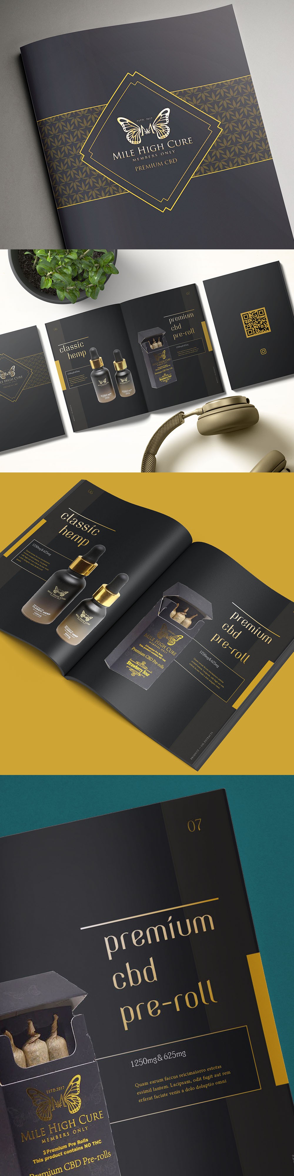 Following the premium black and gold theme, I've used a portrait A5 layout with a two column grid to bring the content to the fore-front. The product images are dominant, with generous white space to add to the luxury feel.